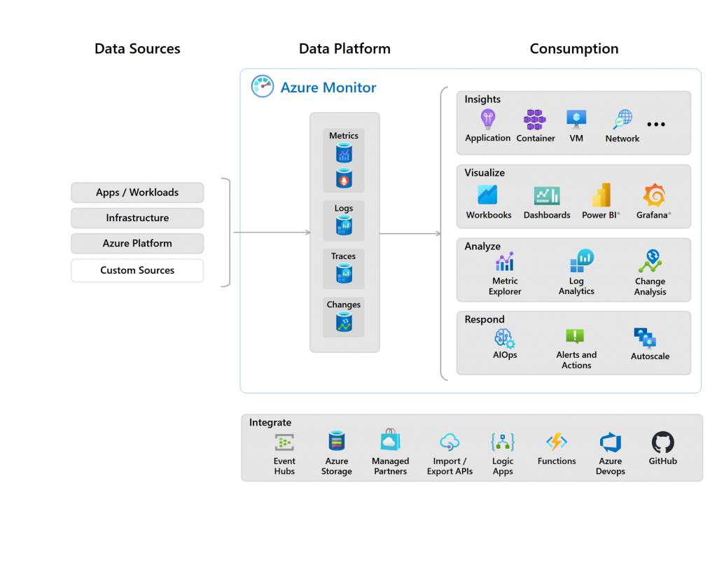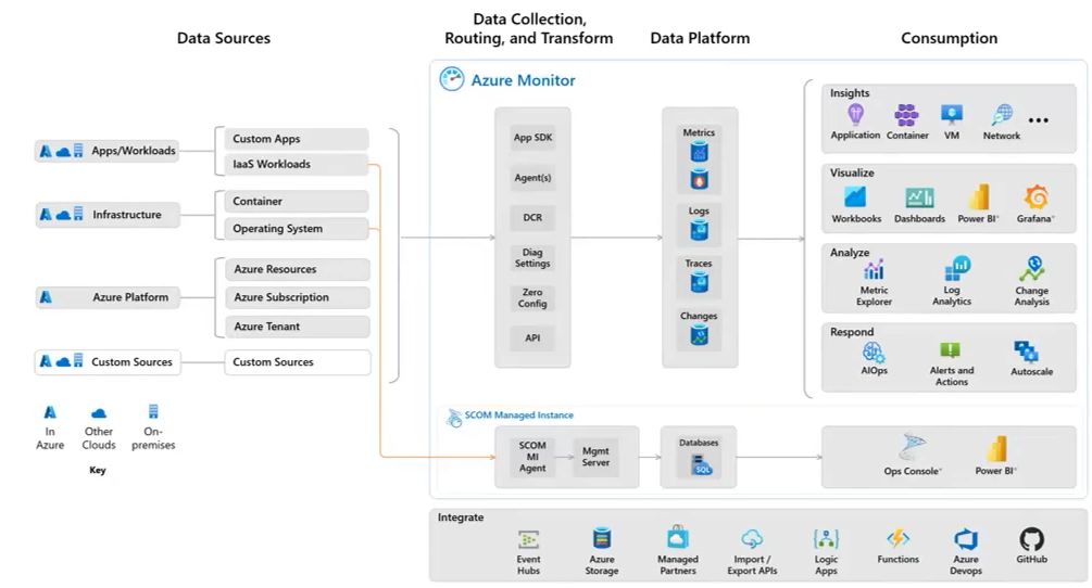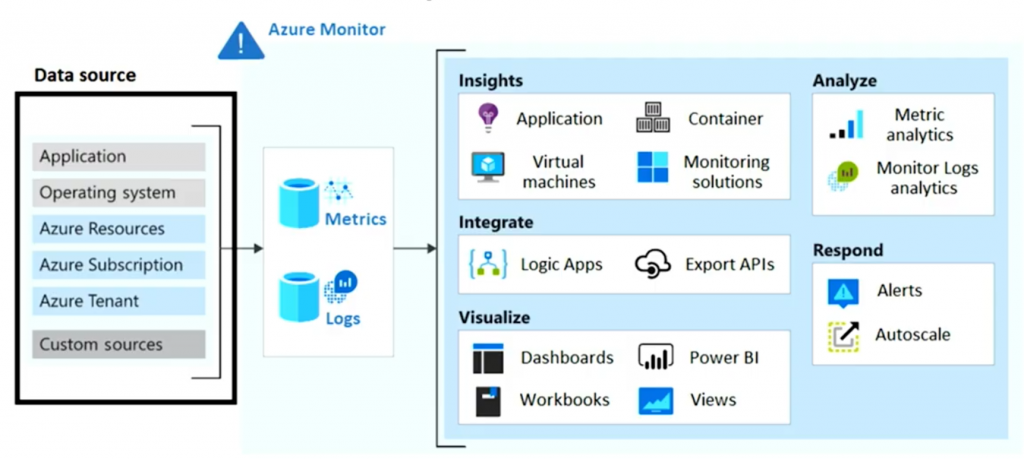 Azure Monitor is a common monitoring data platform that includes metrics, logs, traces, and changes, and it monitors various data sources. The platform offers many features that support two primary components:  Logs and Metrics.