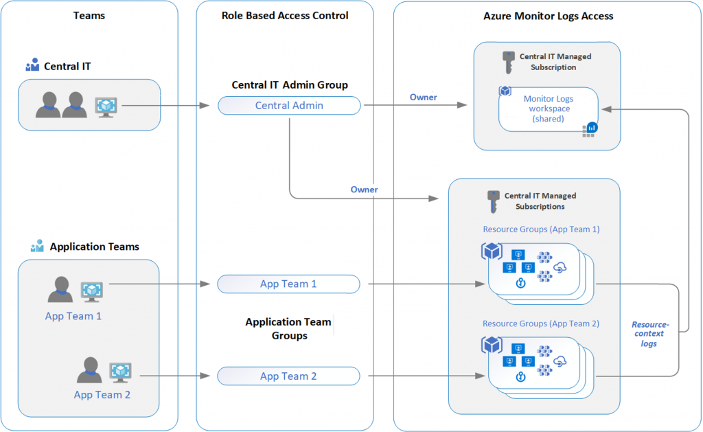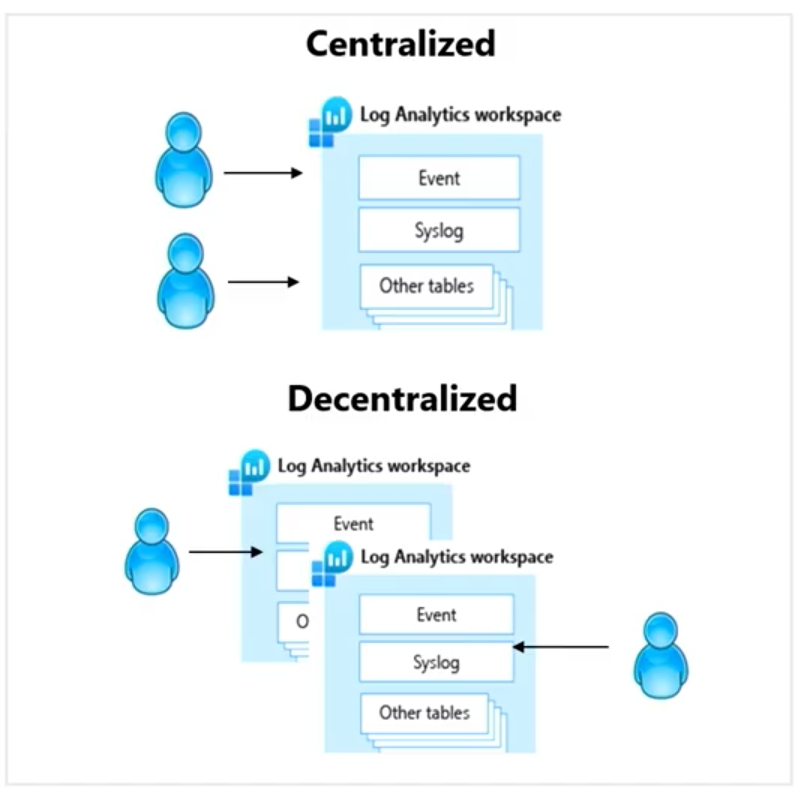 Centralized: All logs are stored in a central workspace and administered by a single team, with Azure Monitor providing differentiated access per-team.