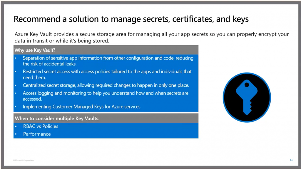When studying for your exam it’s important to understand how your Azure key vault helps manage secrets, certificates, and encryption keys securely.