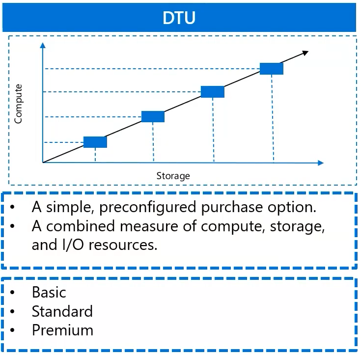 The DTU model, short for Data-base Transaction Unit, is a simplified bundled option. It combines things like your compute, storage and I/O into a single package which makes it easier to choose that service. Remember, there are three tiers; those are Basic, Standard, and Premium, and as you move up the tiers, both performance and storage capacity increases. Remember, you’re going to see a lot of scenario-based questions, so these are the type of things that you’ll need to know.