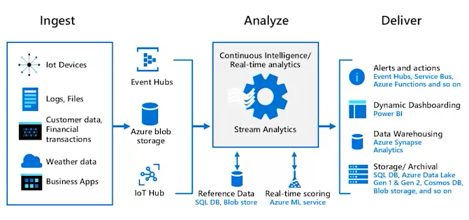 Finally, study the data flow; how data is ingested from sources like IoT hubs and social feeds analyzed in real-time using stream analytics and then how it’s delivered to dashboards like Power BI or to storage like let’s say an Azure SQL database, or some other automation tool like an Azure function.